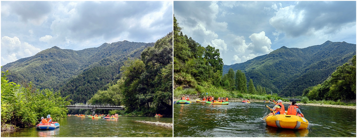 此次行程兩天一夜,在導游的帶領(lǐng)之下,我們首先來到石臺縣大演鄉(xiāng)剡溪村的西黃山漂流景區(qū)。下榻之時,正值正午時分,景點兩岸青山疊嶂、風光旖旎、草木蔥蘢、景色怡人。協(xié)普家人們換好服裝,穿上救生衣,在工作人員的協(xié)助之下,或一家?guī)卓?、或三五好友結(jié)伴乘筏而行、泛舟漂流,水面波光瀲滟、河底各式各樣的鵝卵石靜靜地躺著,日復(fù)一日被溪水沖刷,變得光滑又圓潤,坐在游筏里俯身去看,“瞧,有不少小魚正悠閑地在它的身上游過呢”,其水之清澈由此可見一斑。此次漂流全程3公里,在漂流過程中,除了欣賞到秀美的湖光山色,體驗到劈波斬浪的沖刺暢快感,更讓人愜意的是,在河灘淺水區(qū)域漂流回緩,協(xié)普家人們正帶著孩子們,在這悠閑的時光里愉快的打起了水仗,孩子們帶上了自己心愛的水槍玩起了水槍大戰(zhàn),有人帶來了水盆和水瓢,于是乎水槍大戰(zhàn)現(xiàn)場演變成了潑水節(jié),歡笑聲、尖叫聲蕩漾在山谷之間,在這愜意的時光里,平日的壓力和煩擾仿佛已煙消云散。