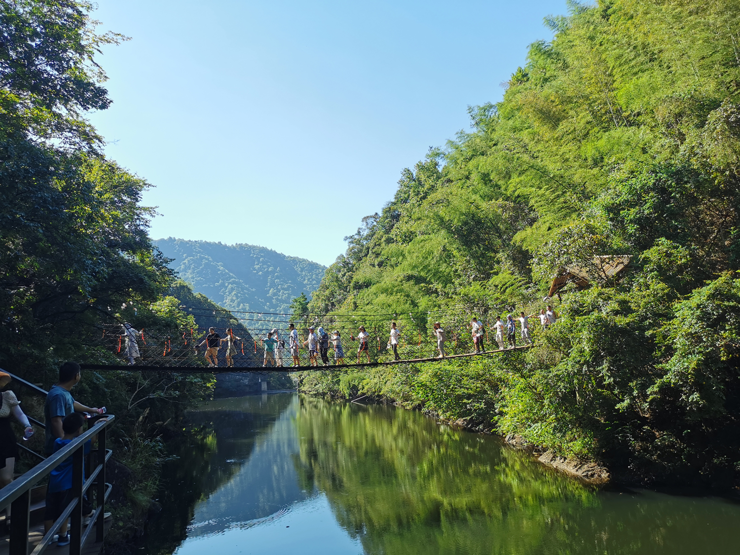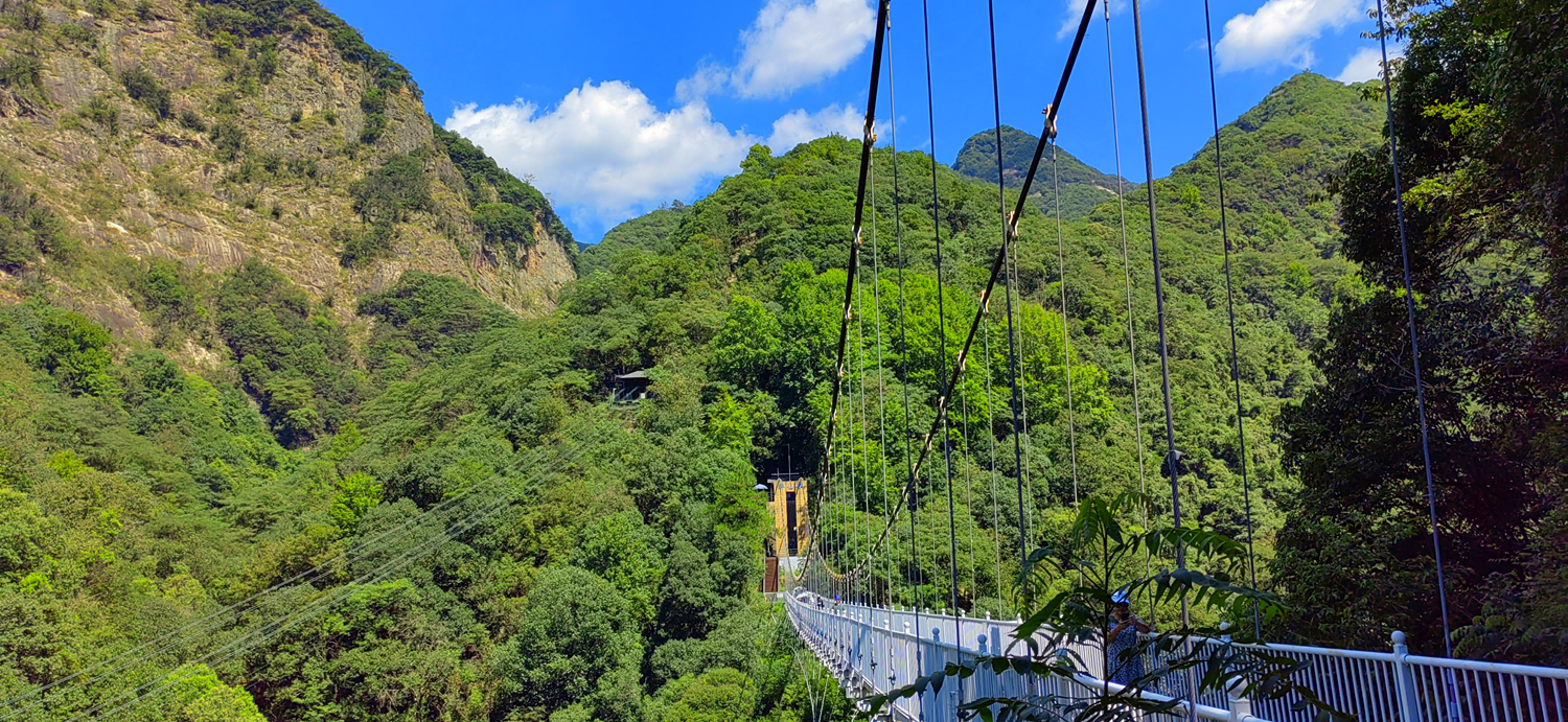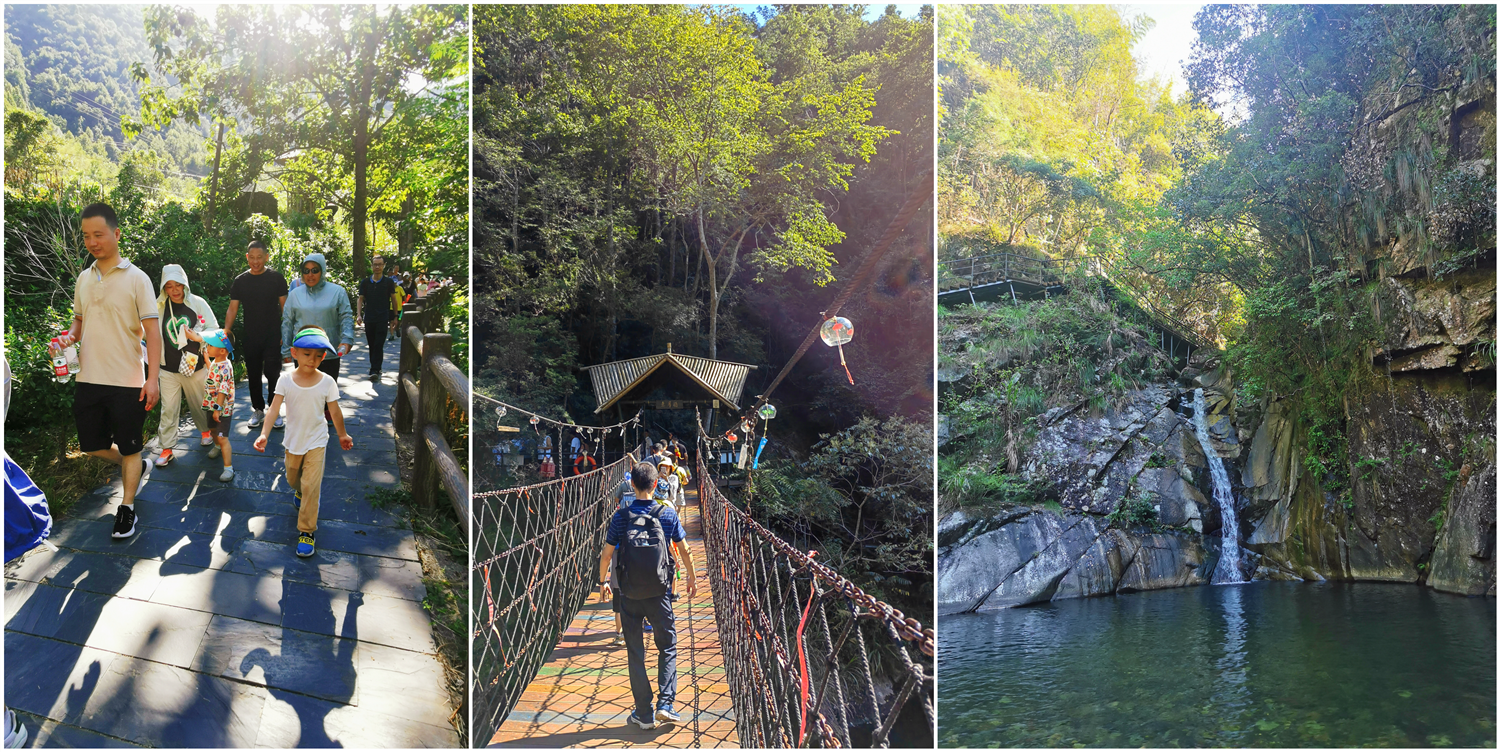 晚上體驗了農(nóng)家樂菜肴和當?shù)靥厣袼藓?,第二天早早的起床,吃完早餐集合,大家興致勃勃地乘著大巴來到了醉山野景區(qū),這里是安徽省內(nèi)第一個5D玻璃橋皖南地區(qū)最大的瀑布群。在進入景區(qū)之前,有一段鄉(xiāng)村道路,徒步的過程頂著早上八九點的太陽就覺得酷暑難耐,然而當我們正式踏入景點,走在山谷間的步棧道上,遠處是蔥郁的山林、近處是流動的溪水、頂上是一片陰涼,只聽見大朋友們小朋友們都在說“好涼快啊,好涼快啊!”沿著步棧道繼續(xù)前行,來到了千花橋,這里是著名的網(wǎng)紅打卡點,小朋友們都絡(luò)繹不絕的脫下鞋子、挽起褲腳,下水嬉戲游玩。有合影拍照的、有撿起小石片仍水花的、還有在石頭縫里抓螃蟹的。大家坐在陰涼的石頭塊上休憩閑聊,甚至玩笑起來,富硒山水、天然氧吧,以后老了退隱山林一定要來這里休養(yǎng)生息。有人不被沿途風景耽誤過久,繼續(xù)往山上攀爬,他們到了山頂穿過了玻璃棧橋,體驗了“一覽眾山小”的視野和格局。由于兩個月沒有下雨,雖有山谷溪流卻看不到震撼的黃崖瀑布群,實屬遺憾,卻也給大家下次再來此一游留下了機會。